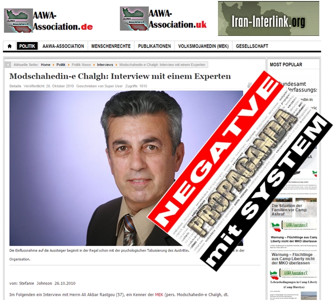 Die Intention des Tarnvereins „AAWA“ ist eindeutig. Er gäbe zwar Menschenrechtsverletzungen und „Probleme“ im Iran zu, aber er kritisiert diese weder ernsthaft, noch belegt er sie mit Zahlen oder Artikeln über Menschenrechtsverletzungen im Iran. Stattdessen bedient er sich des alten Propagandathemas des iranischen Regimes: der Diffamierung der iranischen Opposition, vor allem der Volksmodjahedin Iran (MEK/PMOI) oder des Nationalen Widerstandsrat Iran (NWRI), einem Zusammenschluss von iranischen Oppositionsgruppen, in dem auch die MEK vertreten ist.